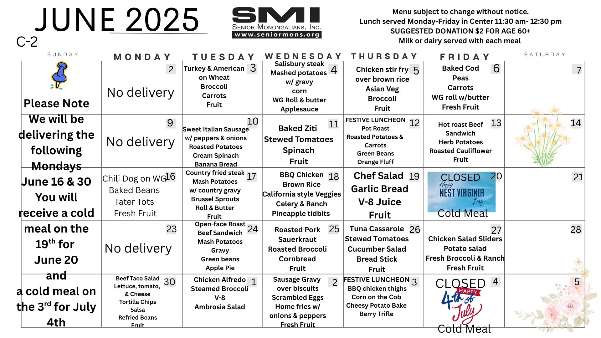 Meals are delivered Tuesday, Wednesday, Thursday, and Friday.